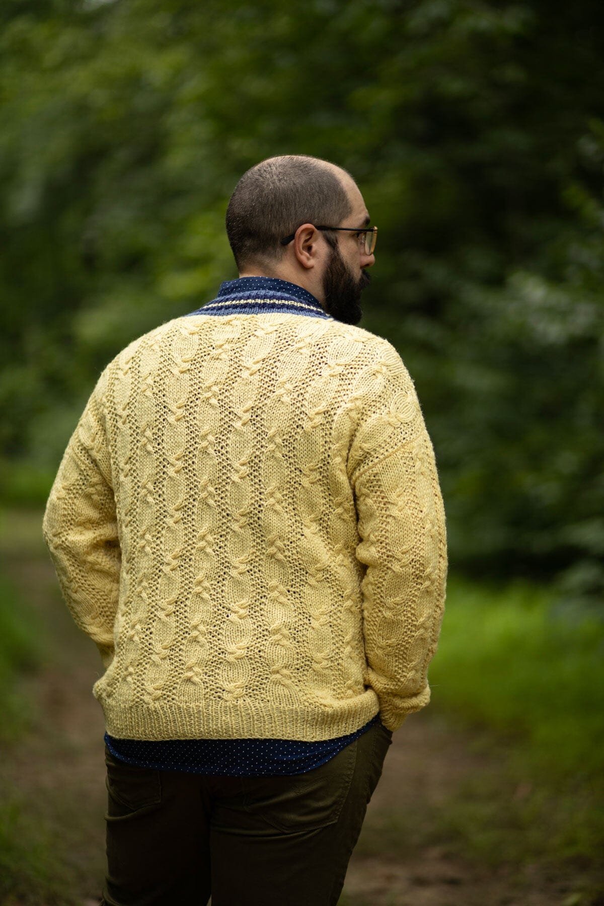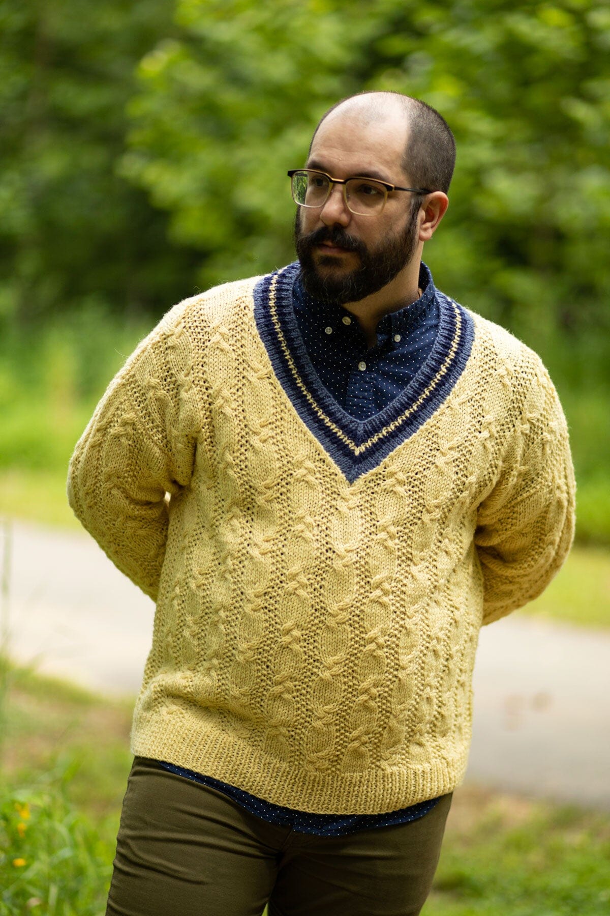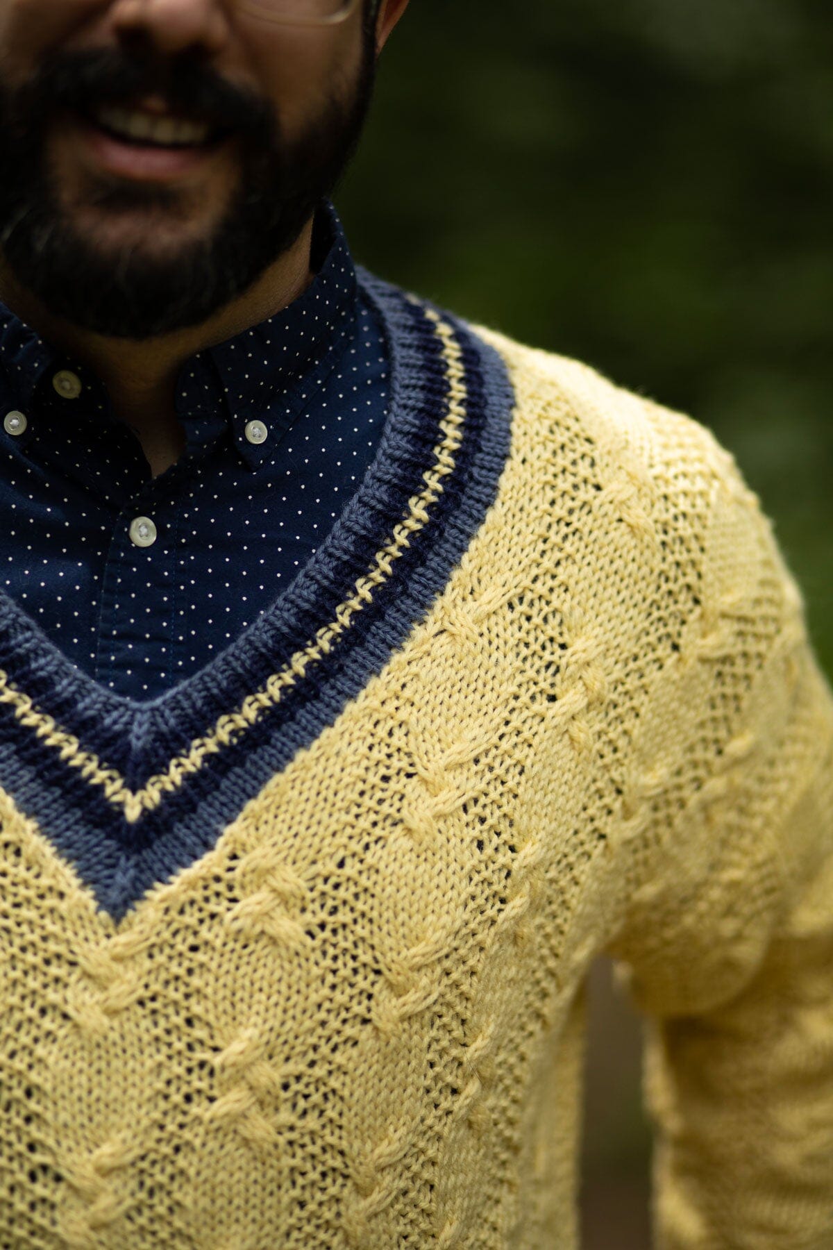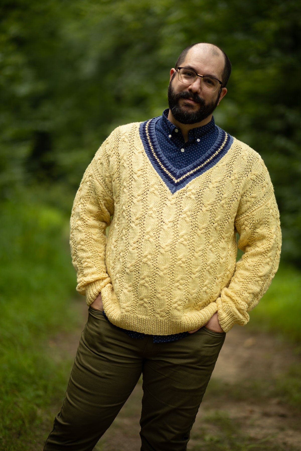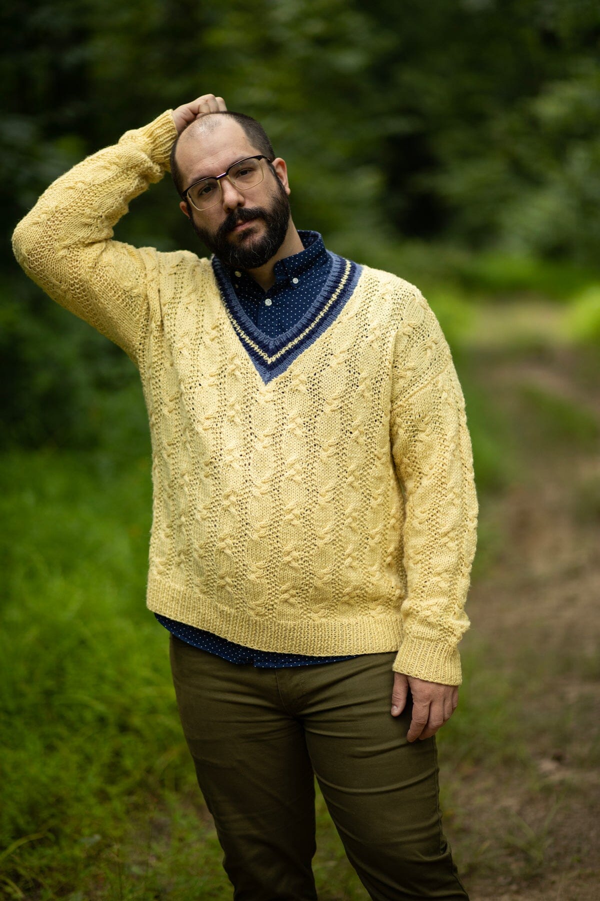 Costanza is a cabled pullover with vintage sitcom charm, as it nods to the sweater worn by a beloved character. Costanza features crisp braided cables, columns of seed stitch, and a preppy V-neck with sporty striped trim. Knit in a trendy butter yellow shade of Deluxe Worsted Superwash, this pullover is playful yet polished. Wear it layered for a classic look, or solo for something with a touch of modernity.