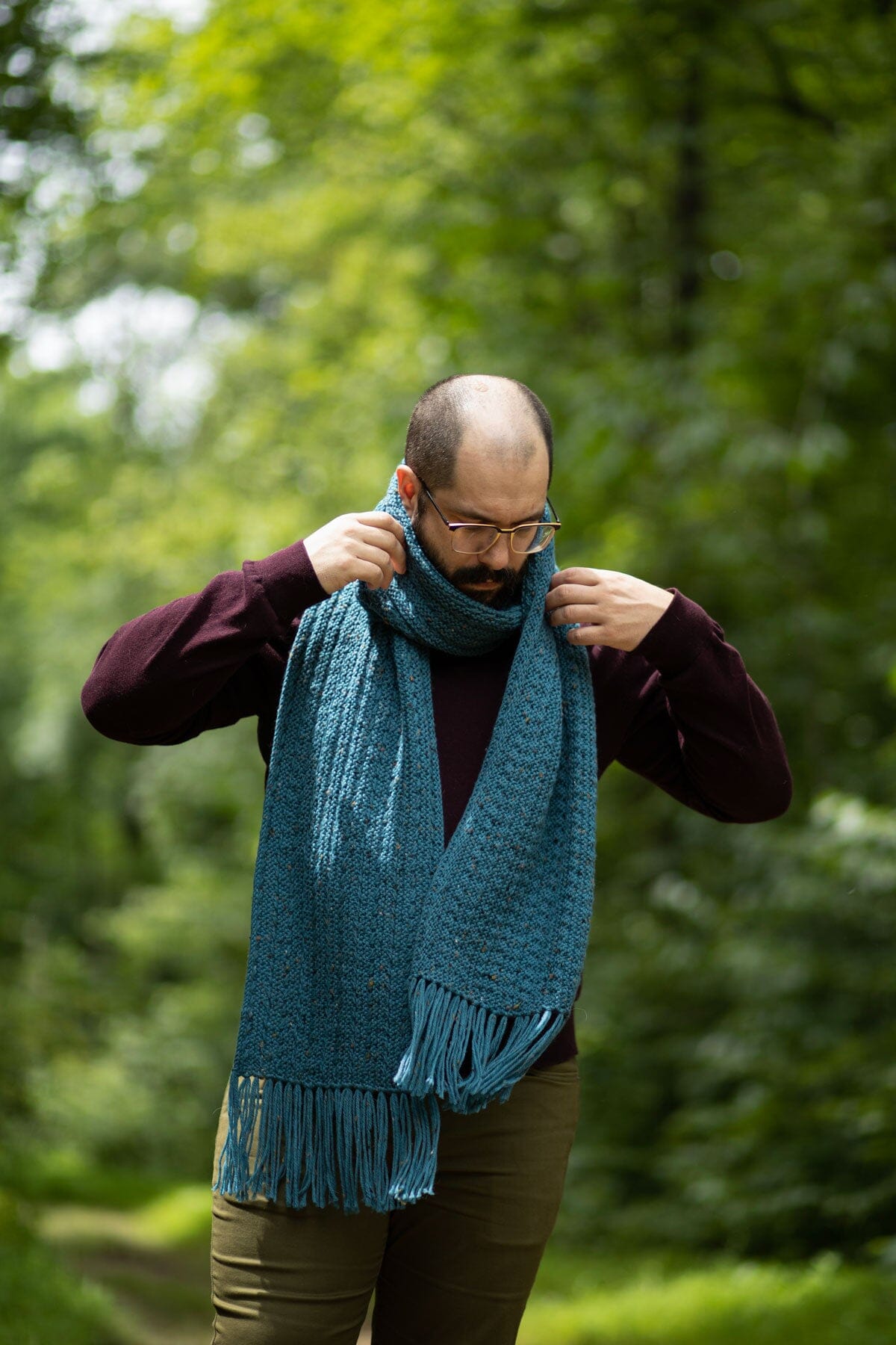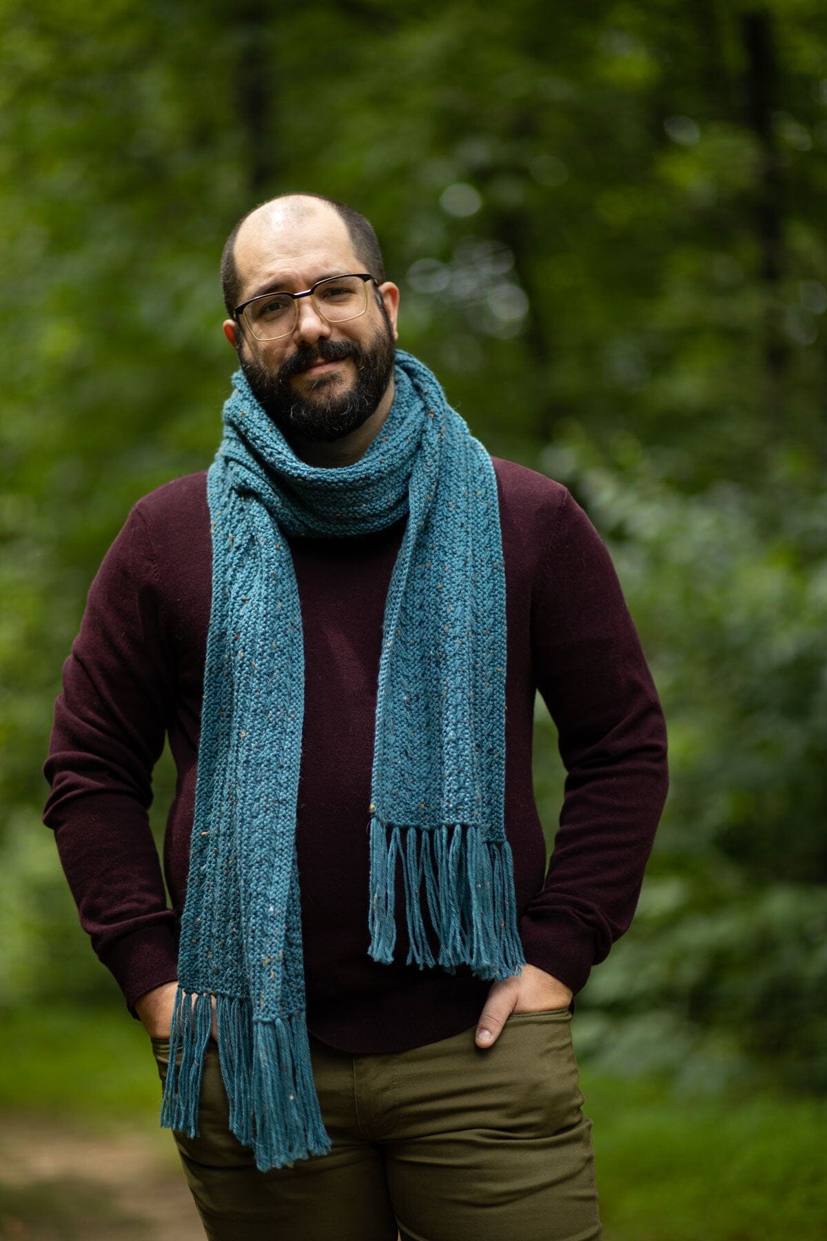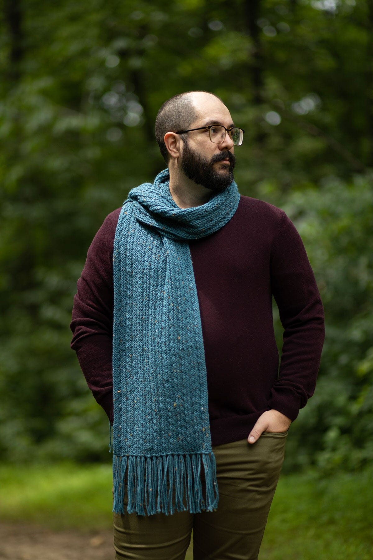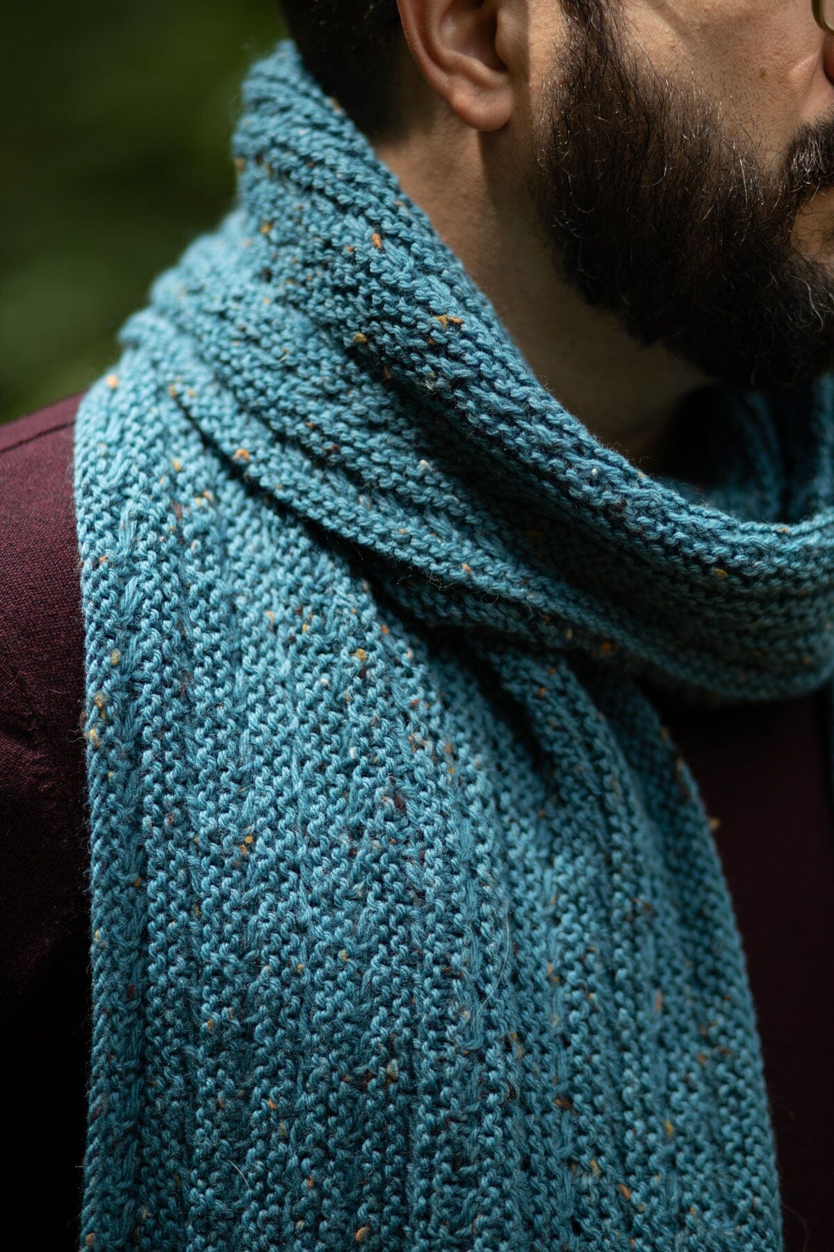 Wrap up in bold style with Erie, a generously sized scarf that blends rugged texture with timeless charm. Featuring alternating slipped stitch cables, crisp garter ridges, and fringe along each end, Erie offers striking texture and cozy warmth. Knit in Deluxe Worsted Tweed, the rich blue hue and tweedy flecks evoke wintry skies over windswept waters, resulting in a cool, classic accessory that adds effortless style to your autumn and winter wardrobe.