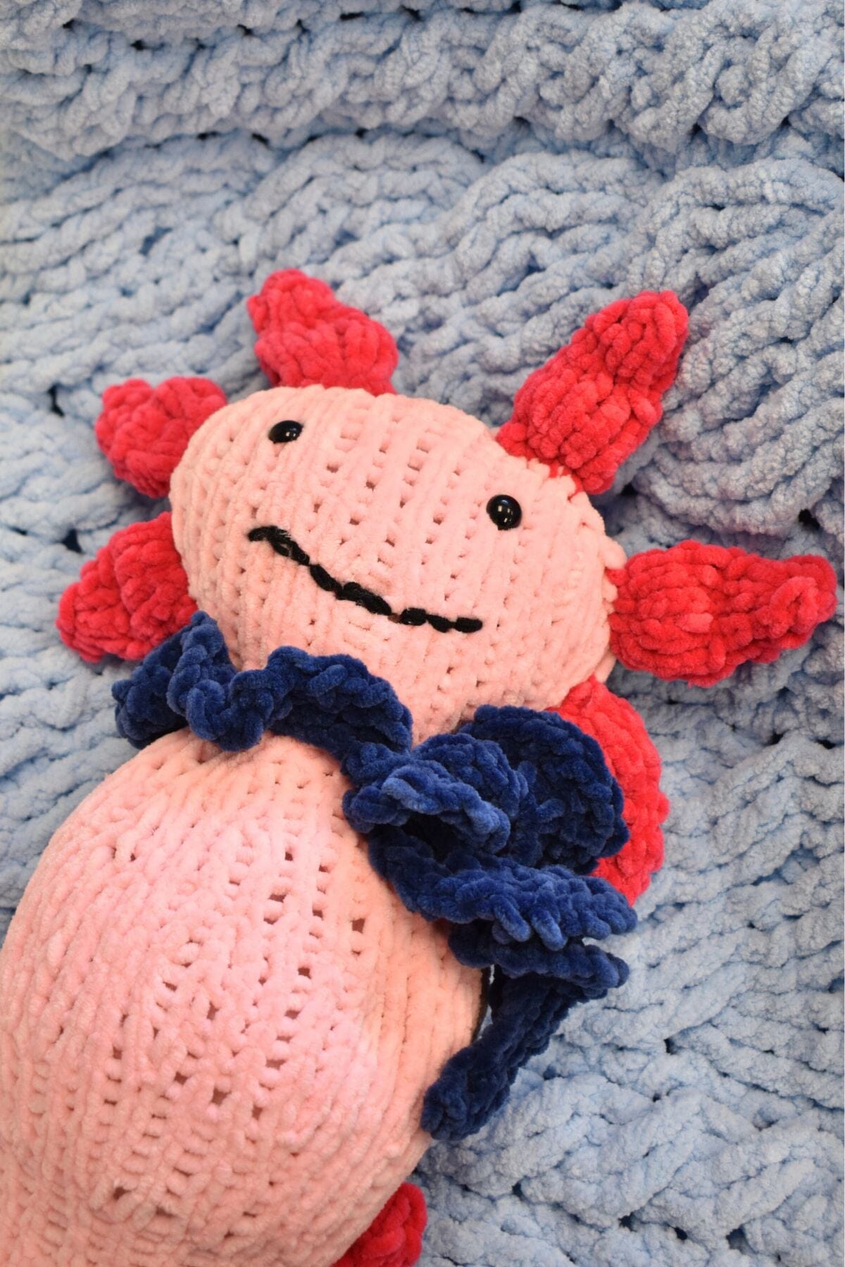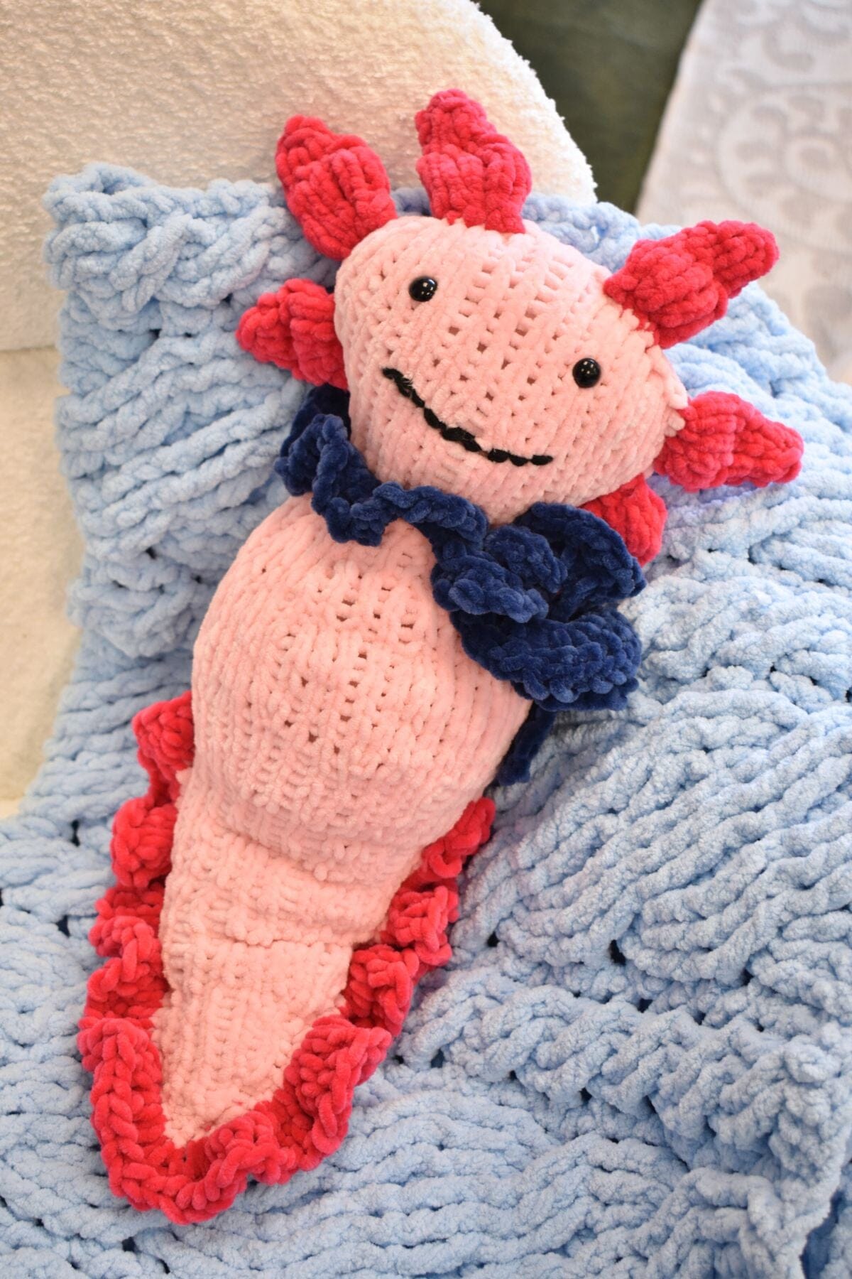 Cuddle buddy alert! Wobble the Axolotl is knit in super-squishy Bella Chenille, making it perfect for hugging, bedtime adventures, and comforting squeezes. Safe, snuggly, and ready for play, Wobble is just the thing for napping, nursery shelves, or brightening up a cozy corner.