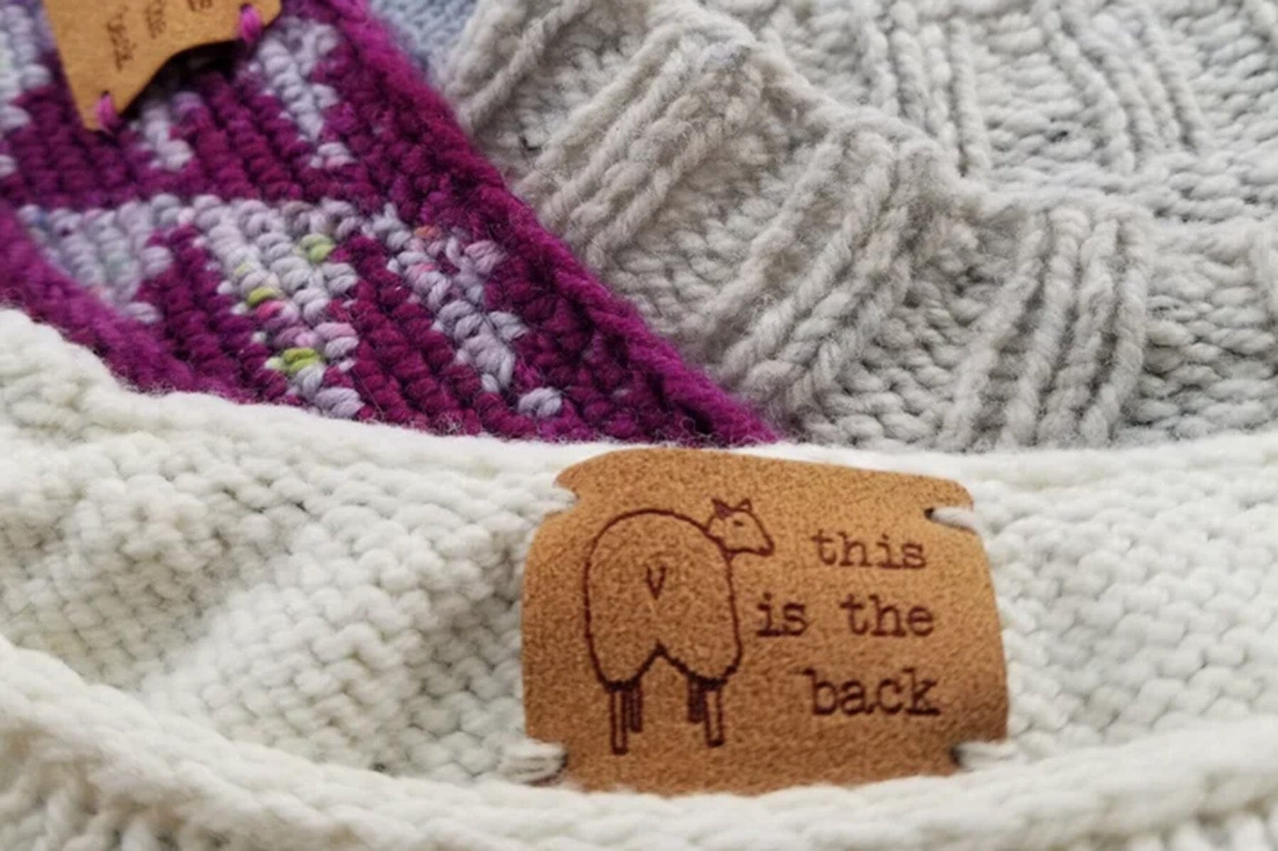 The helpful fuzzy ewe on our new tag is here to take the guesswork out of your latest finished sweater. Stitch the washable tag, made from durable and environmentally friendly faux suede, along the inside of the back collar and this little sheep will make sure you never put a sweater on backwards again! A whimsical and useful addition to many knitwear projects. Perfect for your own use or as a gift for a frequently frustrated friend.
