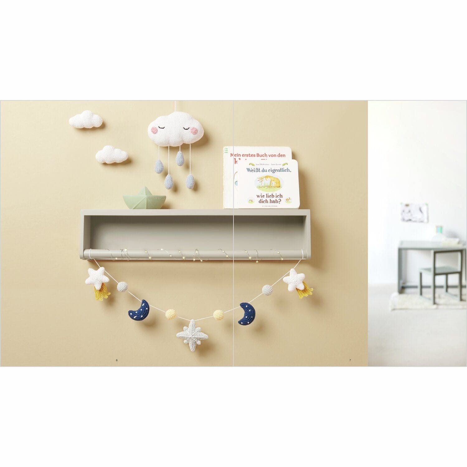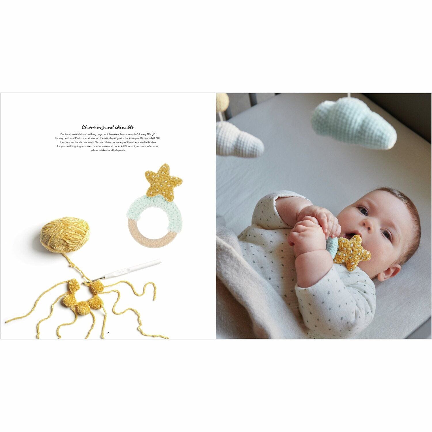 The Ricorumi "Glow in the Dark" booklet features adorable crochet patterns for babies' and children's rooms. Stars, moons, clouds, and little balls are crocheted and can be combined to create mobiles, garlands, and teething rings. The Ricorumi "Glow in the Dark" version glows in the dark and, when combined with the cotton version and Ricorumi Nilli Nilli, is a real eye-catcher—in both light and dark.