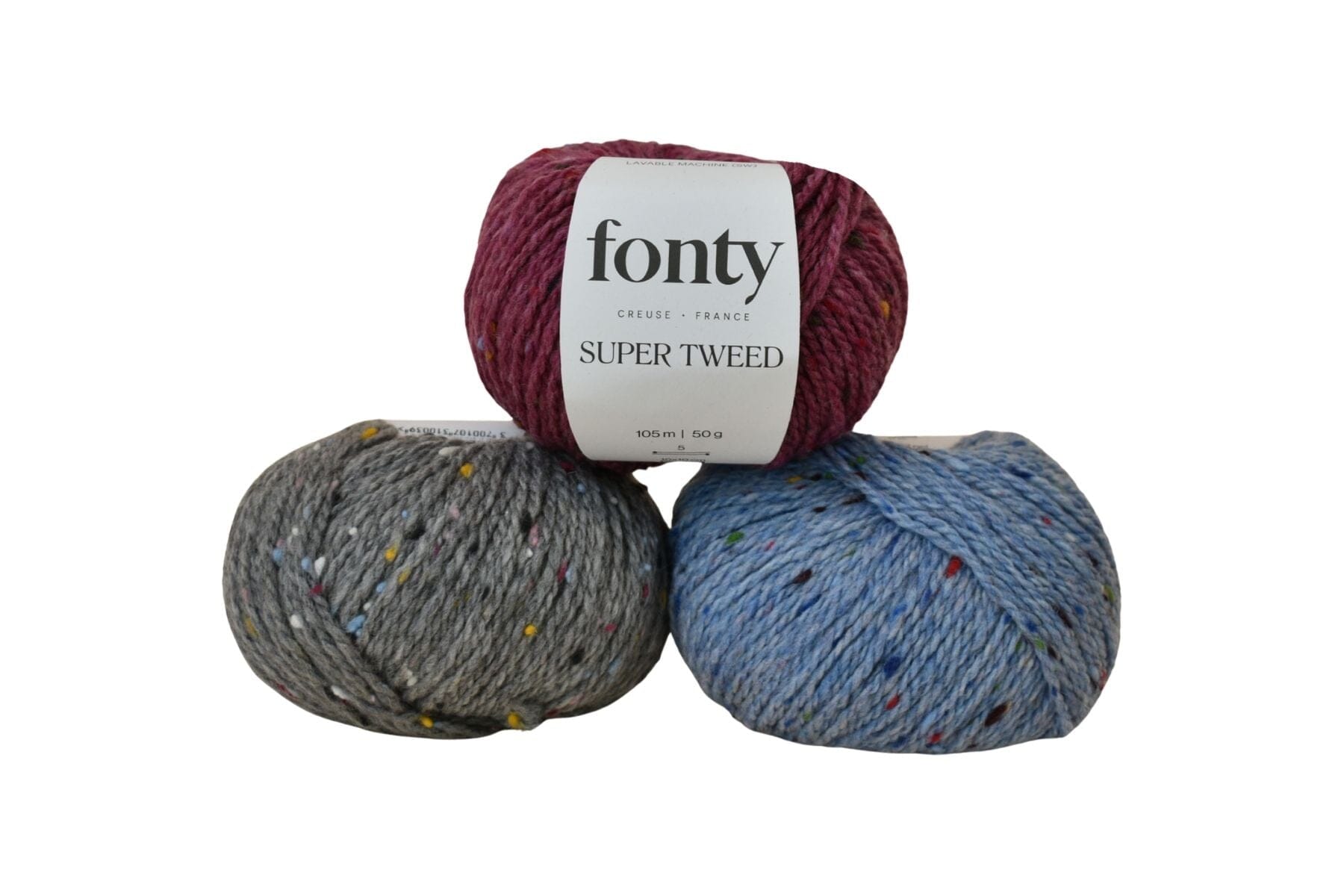 Shop BohemeFonty Super Tweed is known for its unique tweed texture and natural fiber composition. It's made from 95% fine wool and 5% mohair, offering softness, elasticity, and a shiny, bulky appearance. Unique to other tweed yarns, Fonty Super Tweed uses only natural fibers, with the colored "nubs" or "buttons" being dyed wool.