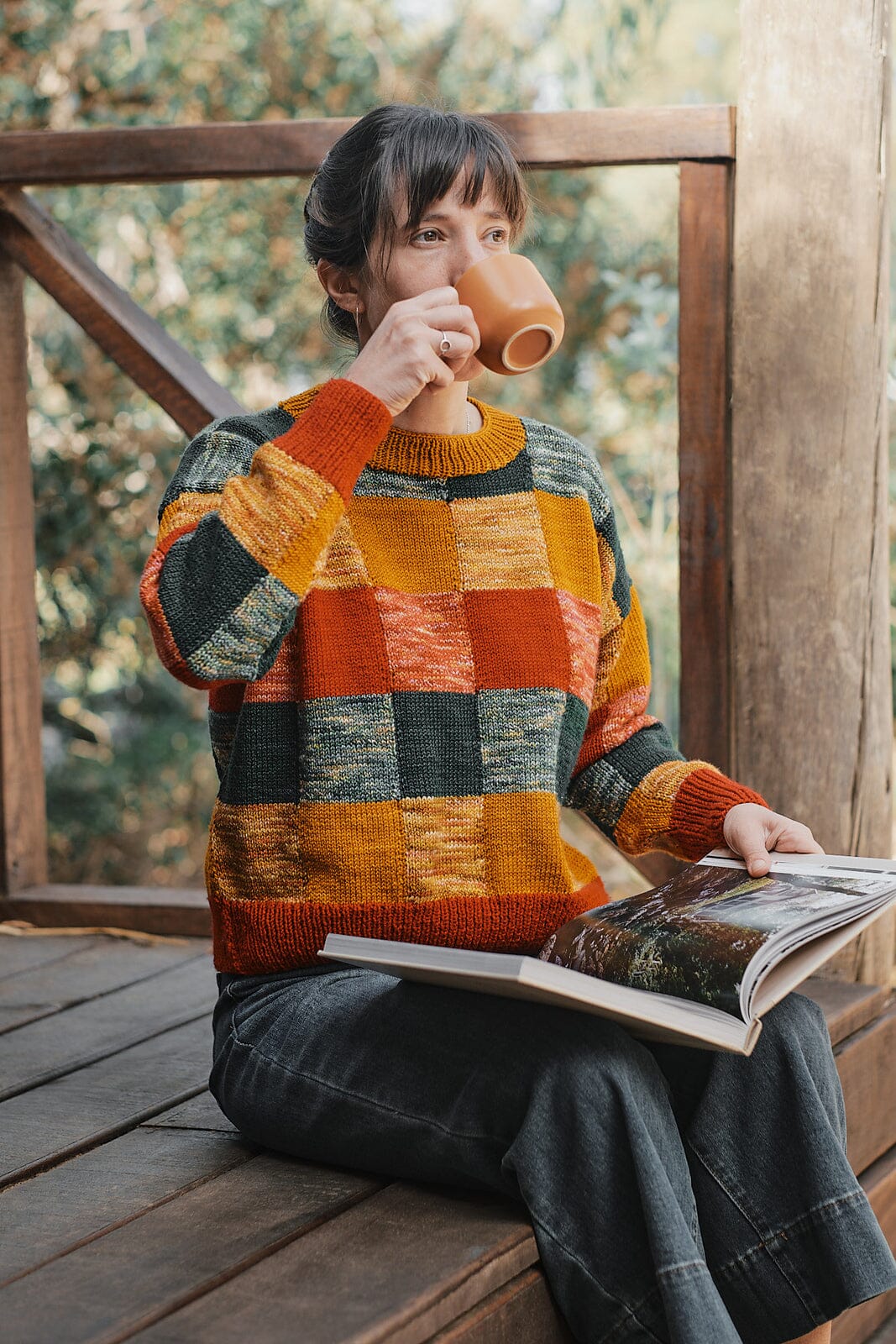 Berta Sweater is worked in flat knitting and intarsia techniques, as a result we have a fun and very striking checkered design. Its simple construction, with straight sleeves and body, allows us to fully focus on the color work technique, achieving a loose and comfortable garment to wear every day.