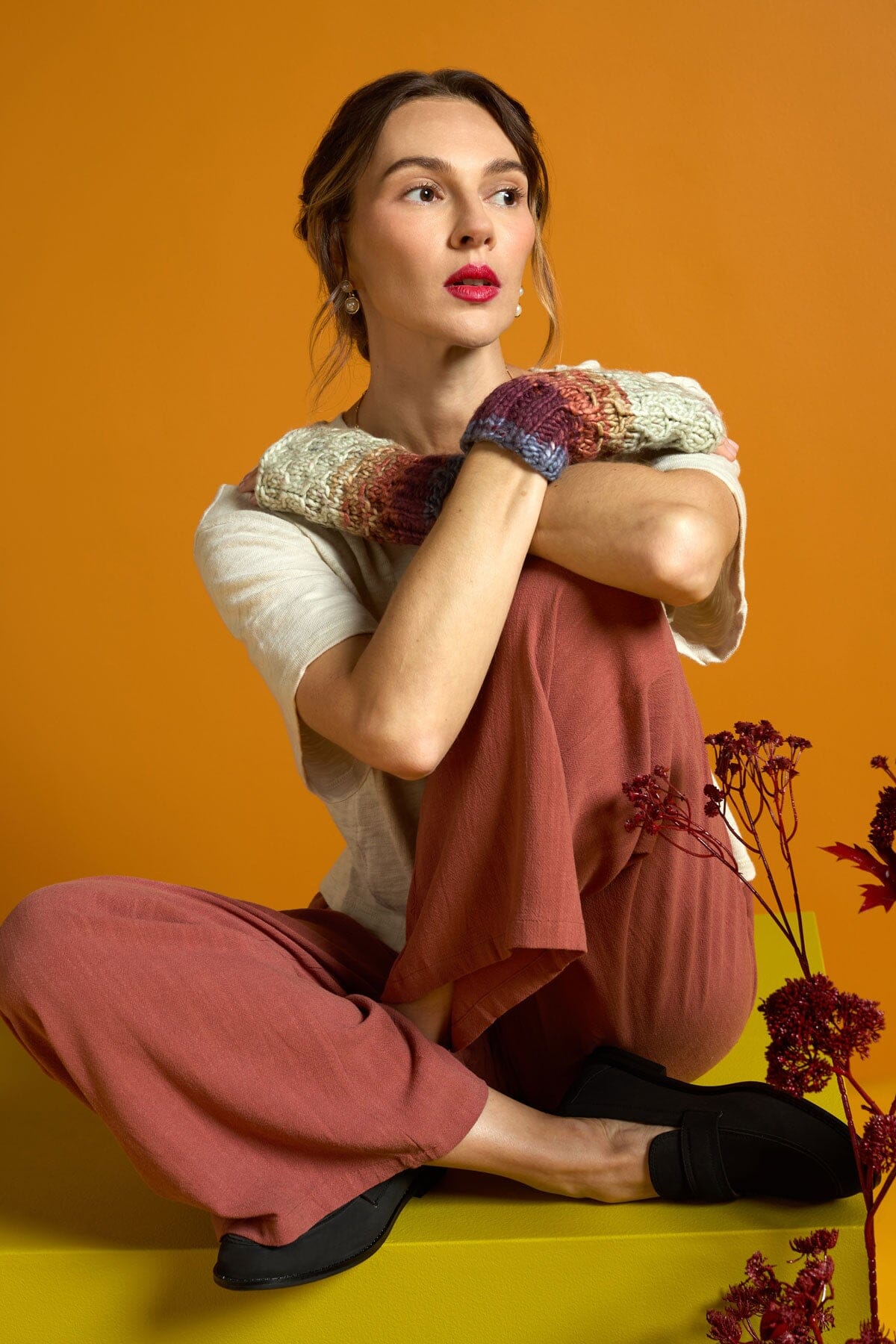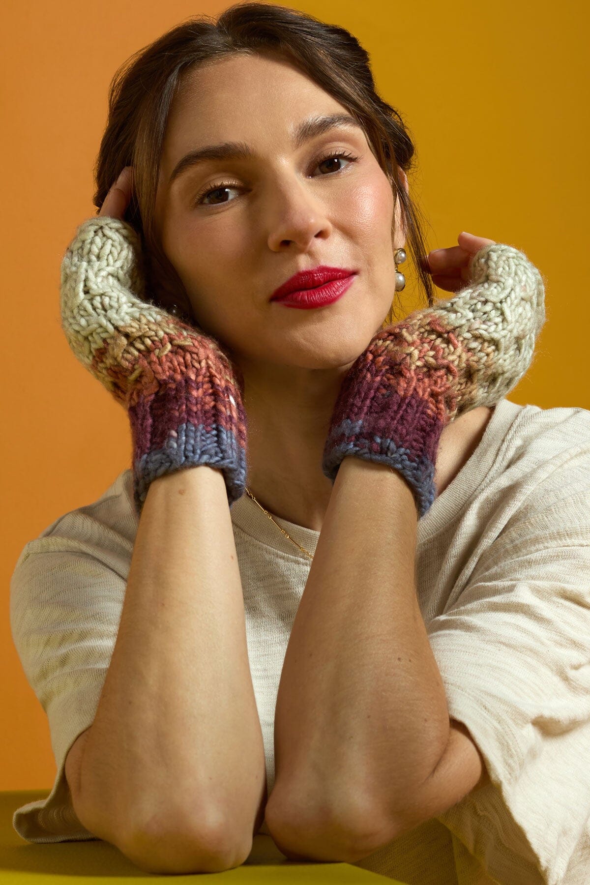 Maman is a self-striping yarn. To ensure your project looks as close to the sample as possible, be sure to visually match the point at which you start each mitt. This may require you to wind off some yarn. We promise the results are worth the effort!<