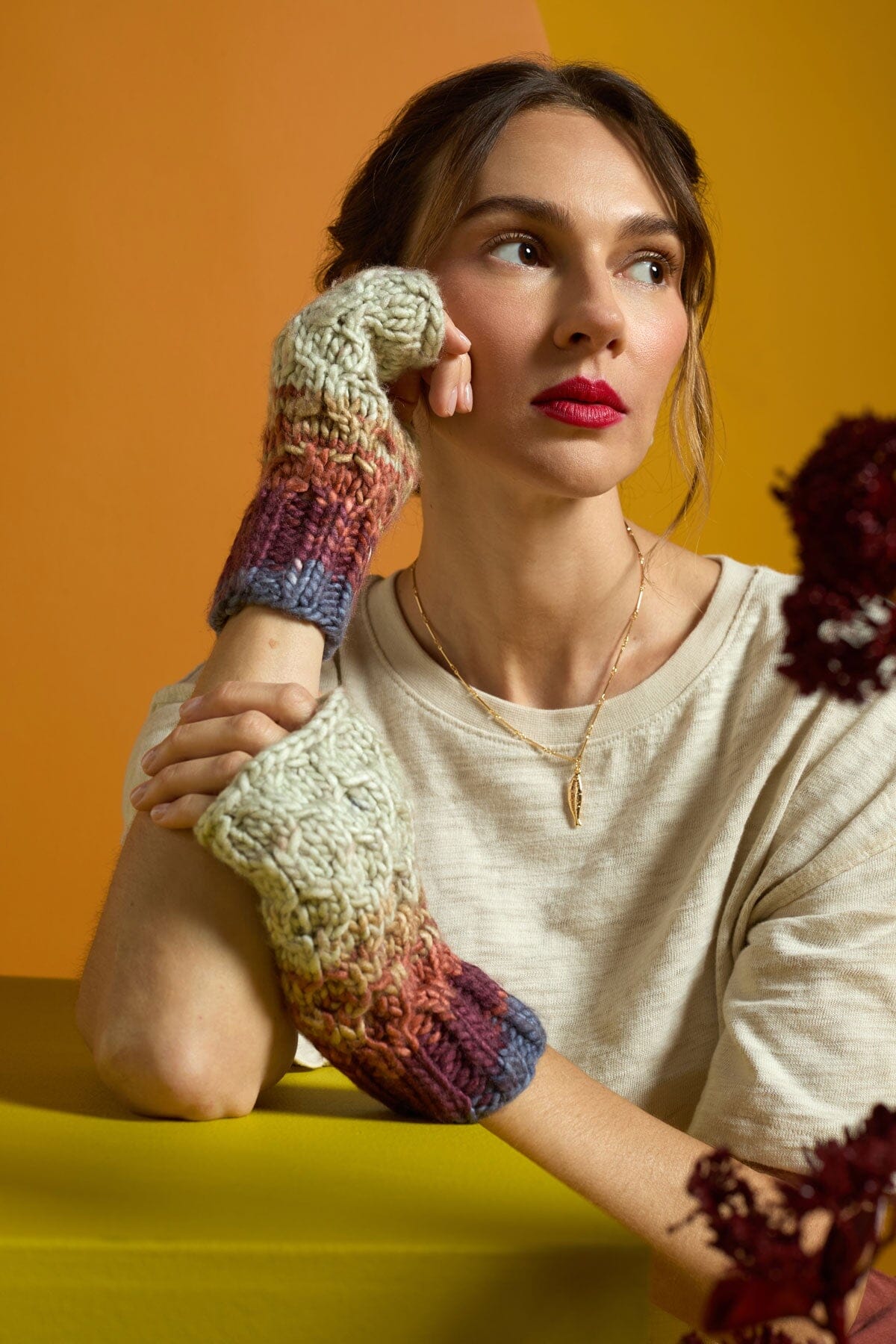 Spice up your look this season with the Allspice fingerless mitts. Like a stroll through the park on a brisk fall day, honeycomb cables meanders over a field of ever-changing autumnal hues. Our bulky Maman yarn yields thick, warm mitts that work up in a flash.
