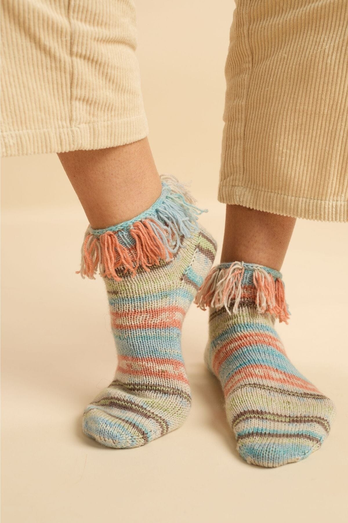 Add a dose of fun to your daily comfort with the Fringe Socks, made in playful, self-patterning Saunter. The standout is the fringed cuff, bringing a lighthearted twist to a classic, cozy staple. Easy to wear and sure to make you smile, these socks are perfect for anyone who loves a little flair with their warmth.