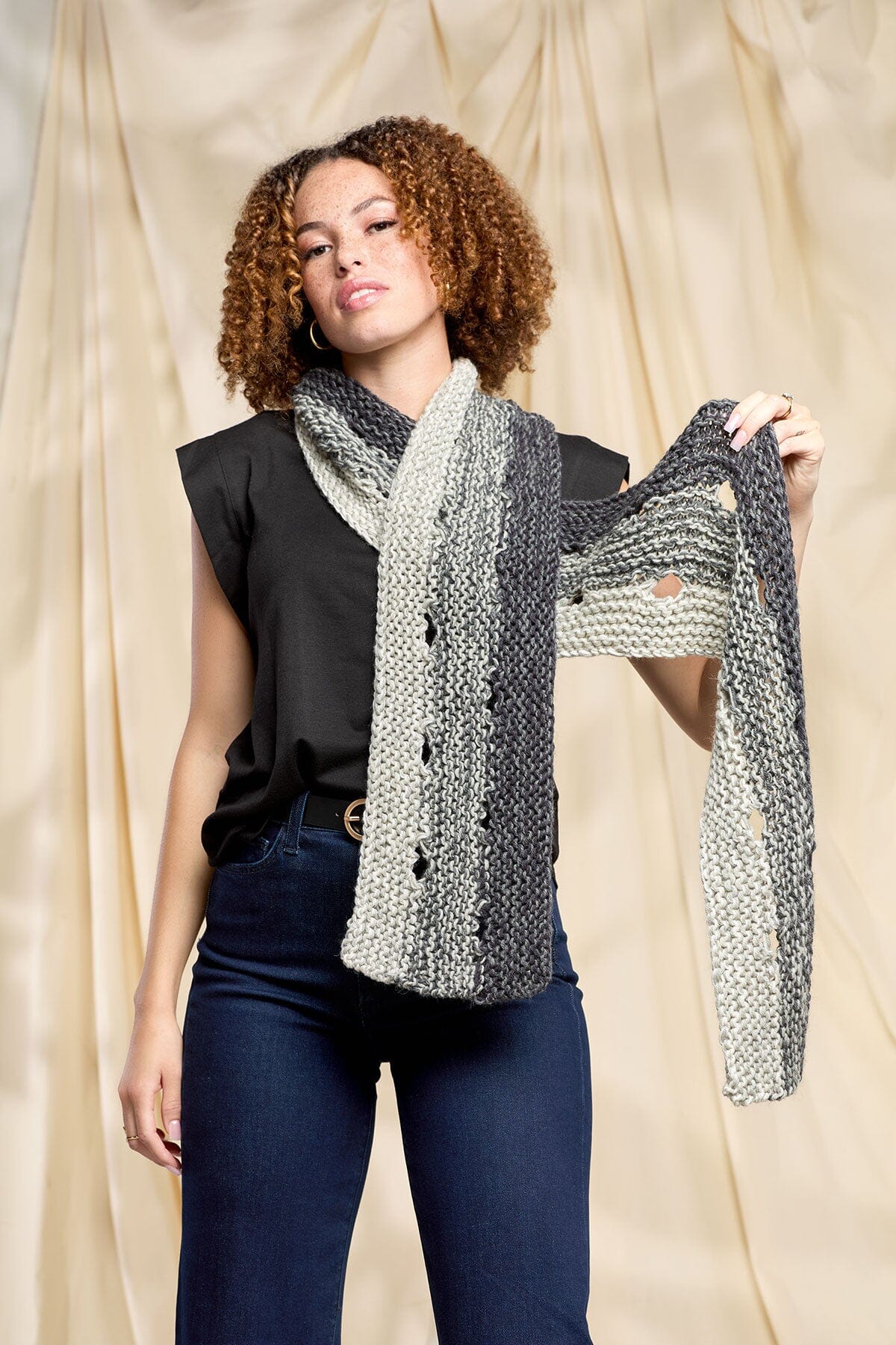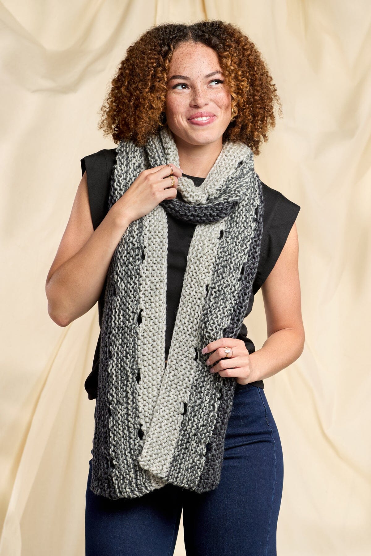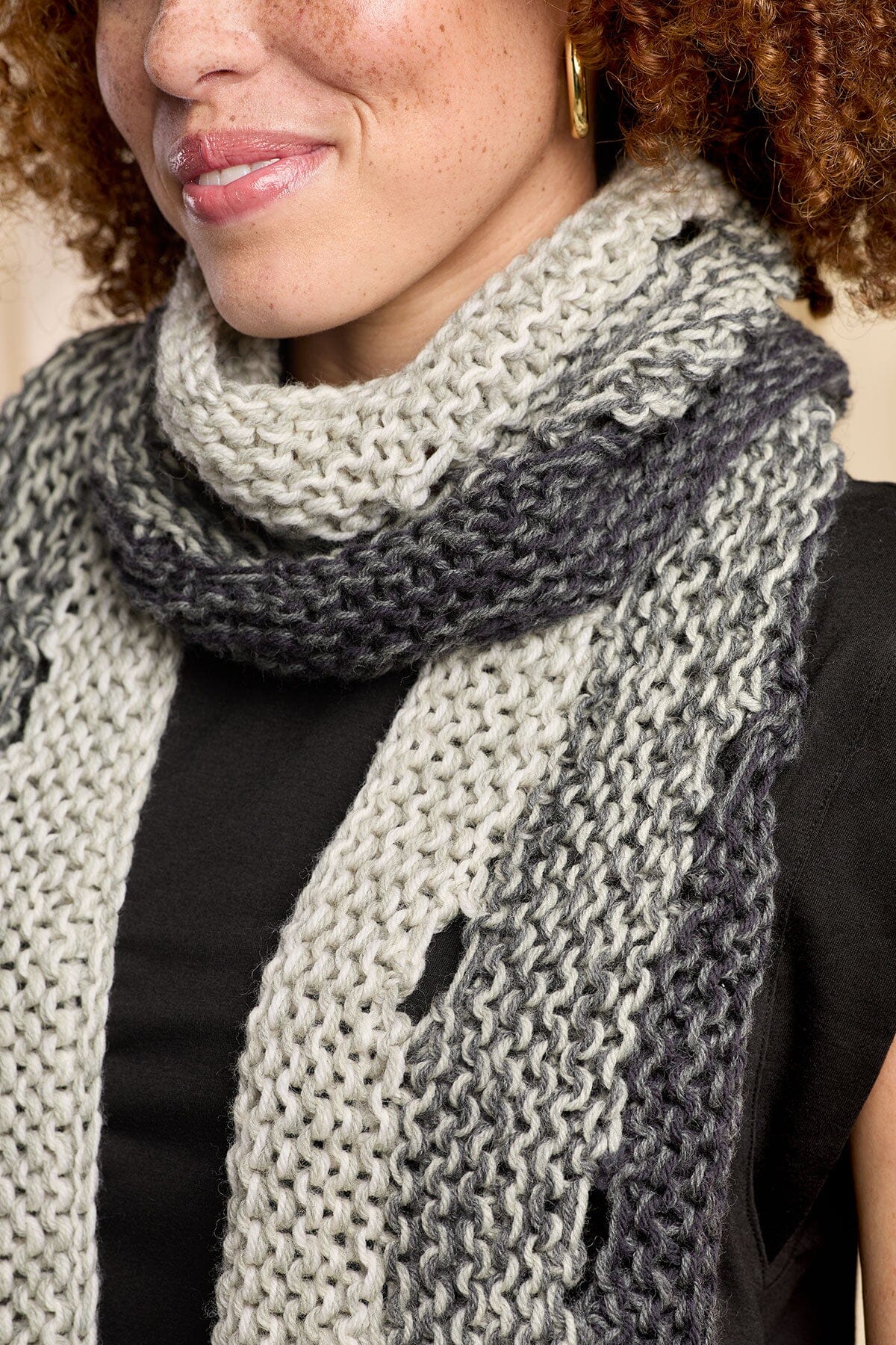 The Marled Scarf is a modern take on basic garter stitch. Four shades of our soft and durable Deluxe Worsted Superwash yarn blend to create a marled gradient of newsprint greys, while deliberately placed holes in the fabric give this piece a chic distressed look. The simple stitch pattern and edgy vibes make for a beginner-friendly project with bold results!