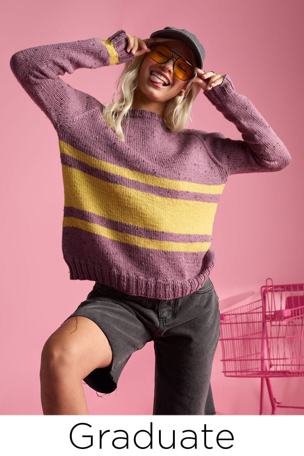 Finally, bring all your new skills together with a sporty raglan pullover knit in Deluxe Worsted Tweed Superwash and Deluxe Worsted Superwash.