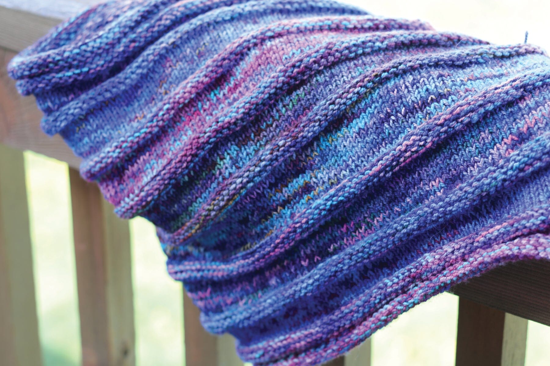This cowl is worked in the round from the bottom up. Two strands of yarn in contrasting colors are held together throughout to create a marled effect.