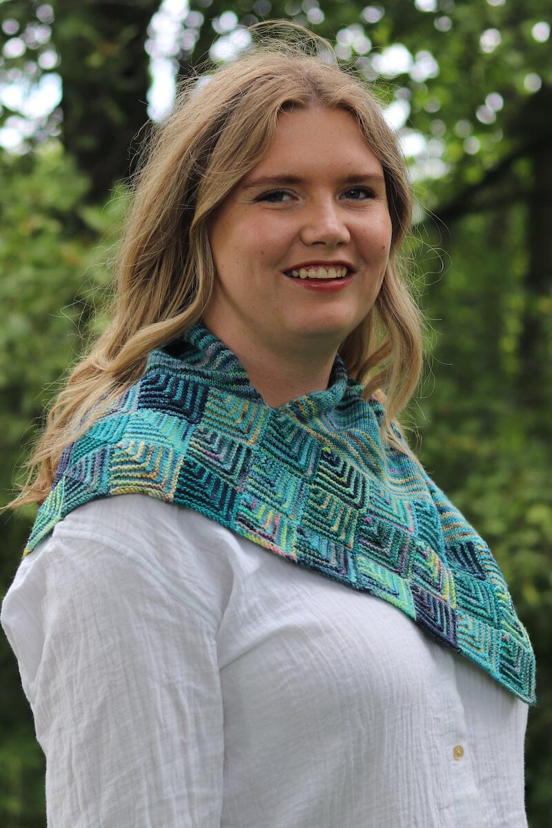 The Tiny Poncho Cowl was designed to look like a bandana cowl in the front, but includes a point in the back as well to keep the back of the wearer’s neck warm.