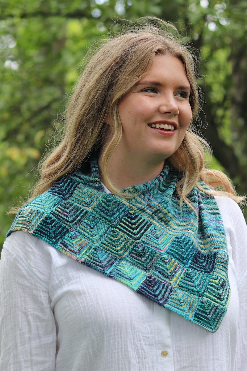 This cowl is knit flat and seamed. It consists of a striped stockinette section and a wide band of mitered squares.