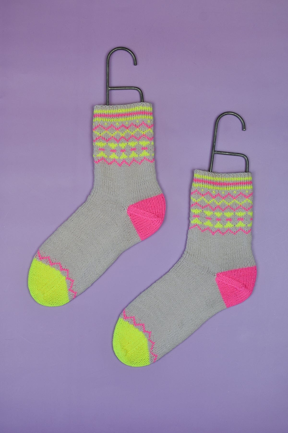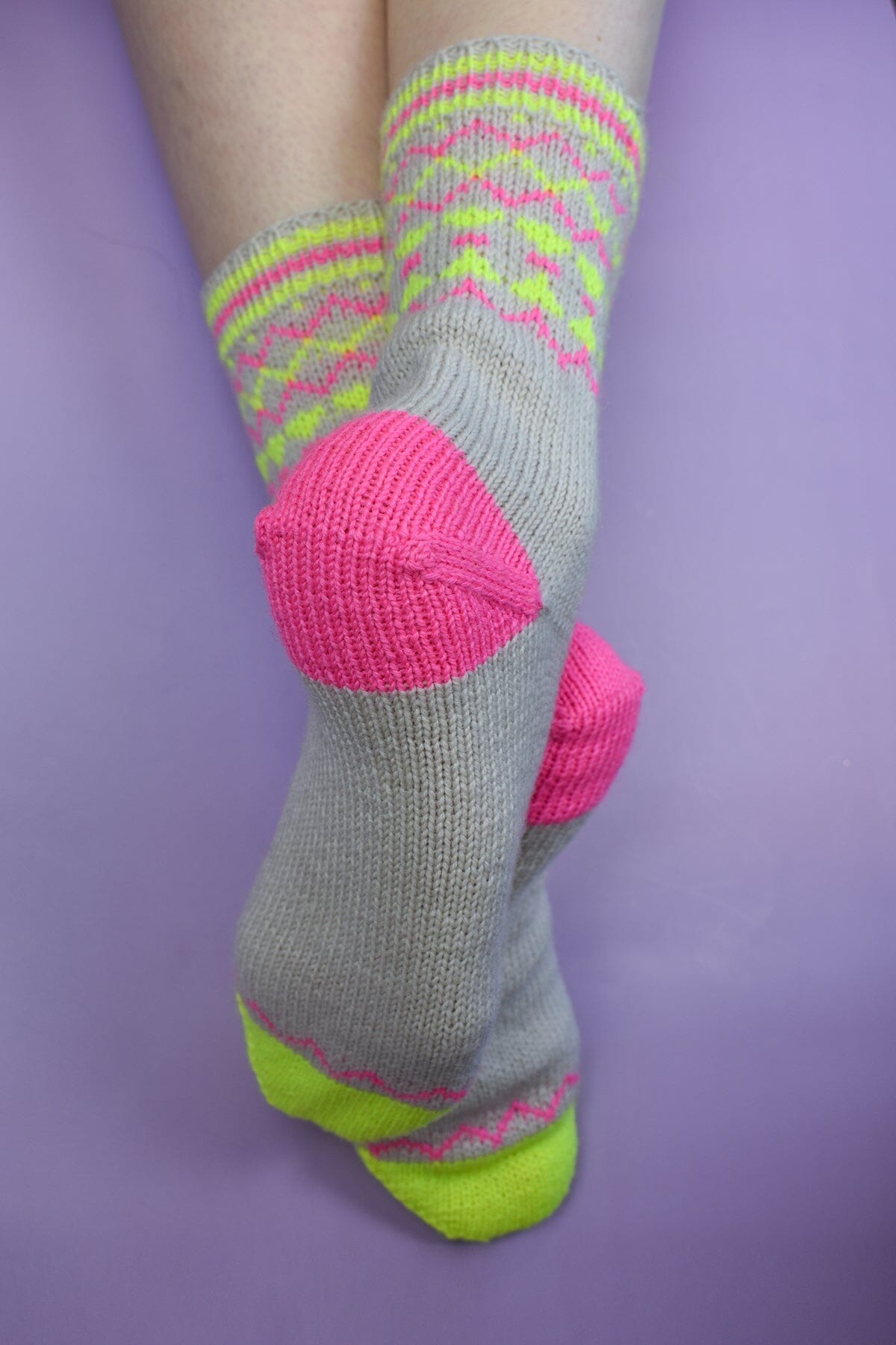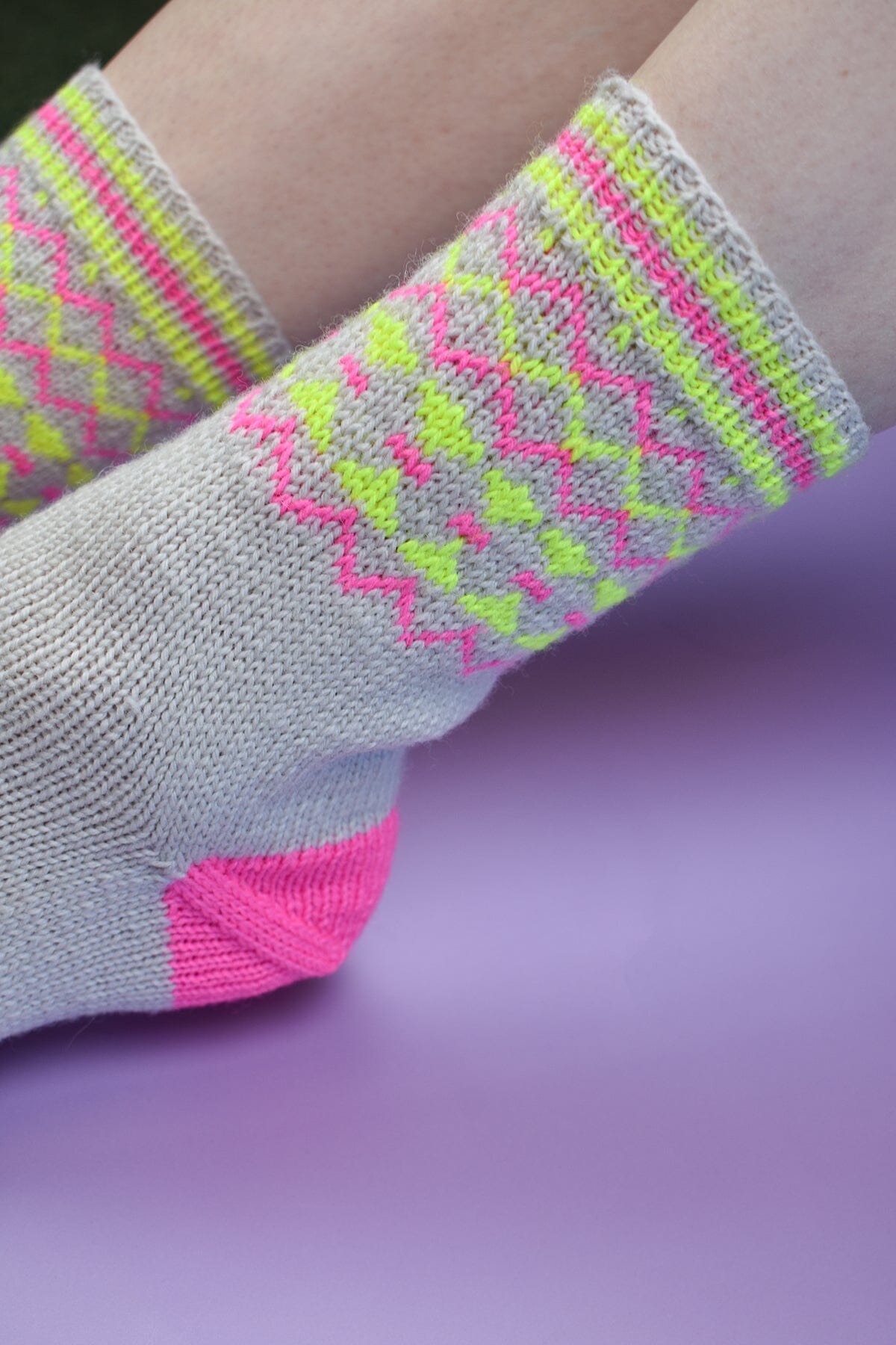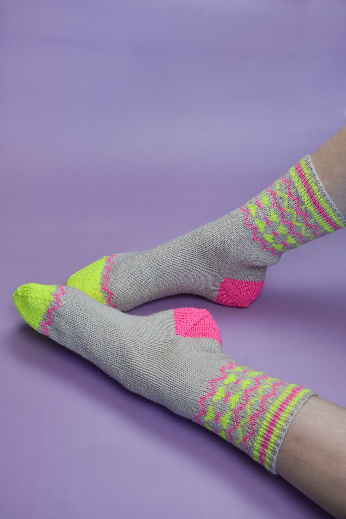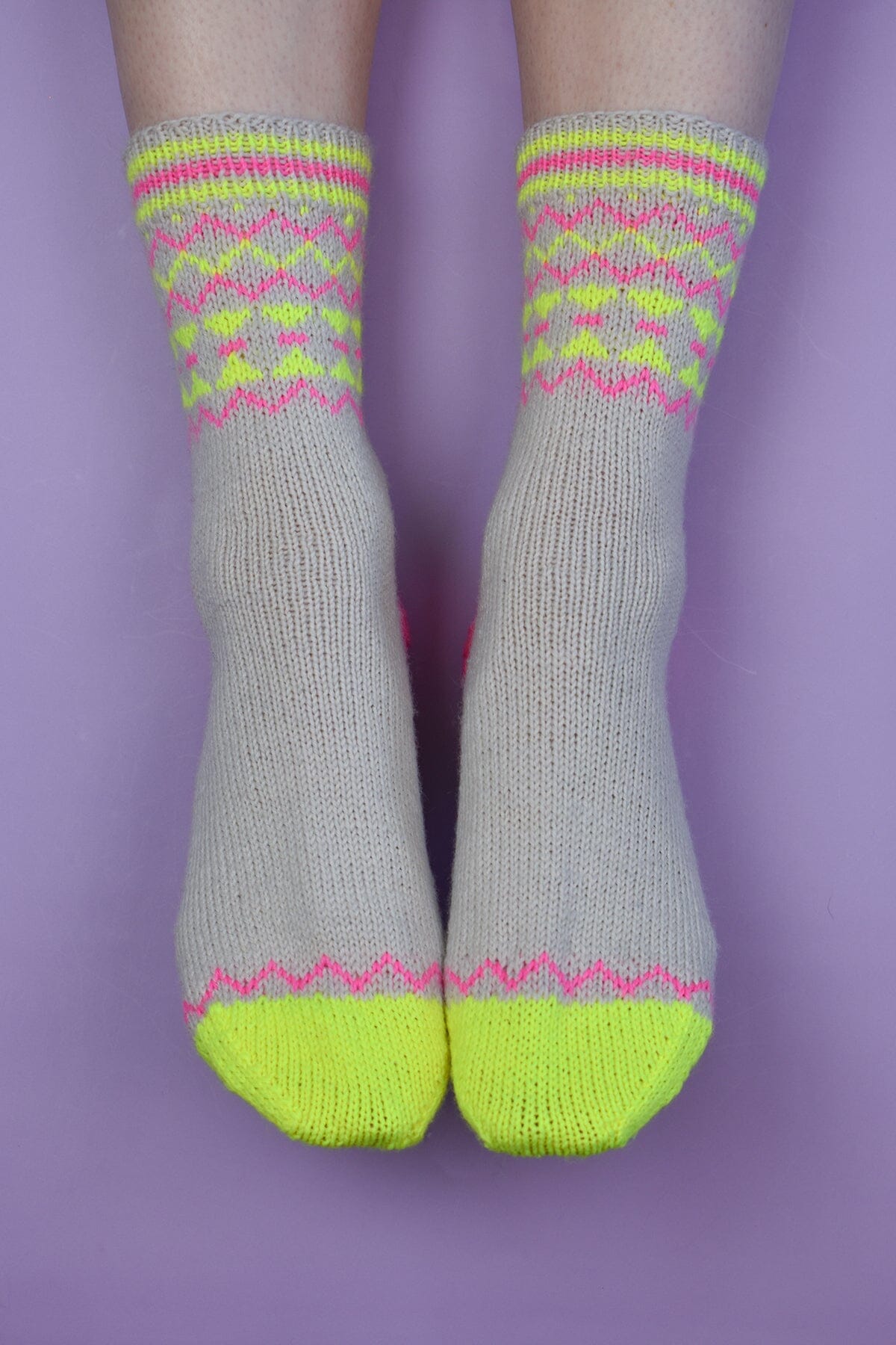 The Trig Socks are a love note to the combination of neons and neutrals. The pop of neon on top of a background of soft beige is just so eye-catching. These socks feature playful color-blocking, stripes, and geometric stranded knitting to add to the fun. Our soft, durable, and easy-care Uni Merino and Uni Merino Minis are a perfect complement to the design, and we know these socks will make you want to dance!